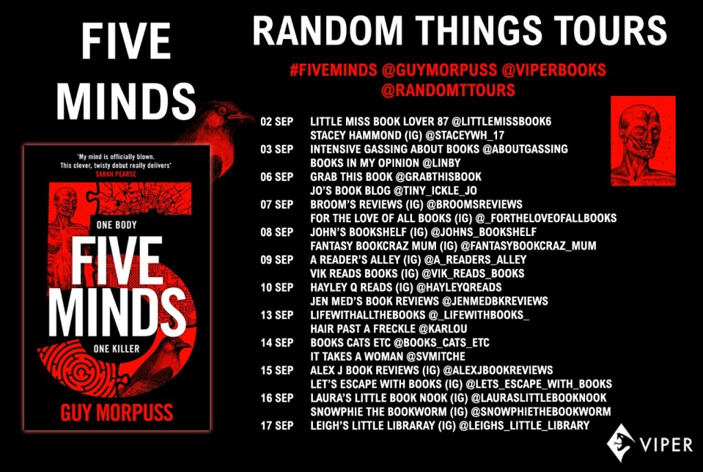 Published by Viper Books, Five Minds is available to purchase now in hardback, eBook, and audio formats. Huge thanks to the publisher and Anne Cater of Random Things Tours for the review copy and the opportunity to take part in the blog tour.