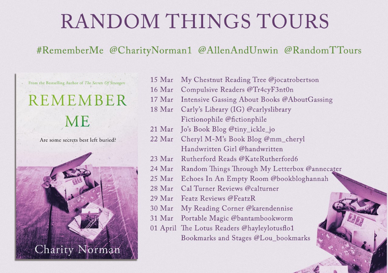 Remember Me is published by Allen & Unwin and is available now in paperback, digital, and audio formats. Huge thanks to Anne Cater of Random Things Tours and the publisher for the opportunity to read and review this novel as part of the blog tour.