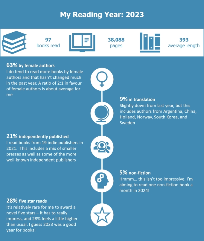 I read more books in 2023 than in 2022, although that number is still down on where it’s been in previous years when I’ve easily passed the 100 mark. The books I read in 2023 were longer on average, though, which will account for some of the difference. You can see my favourite books of the year here.