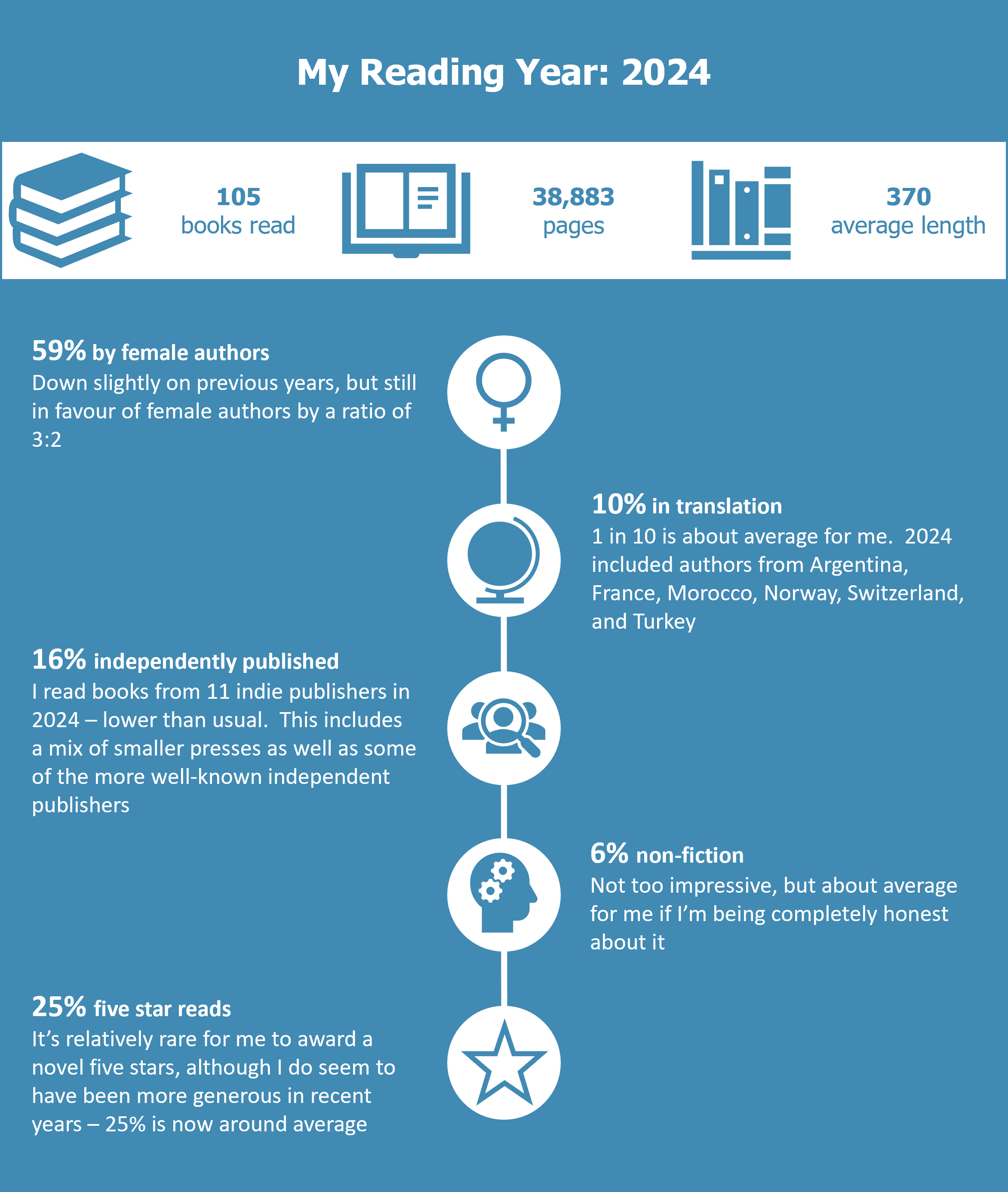 And a few more reading stats for the last year:
